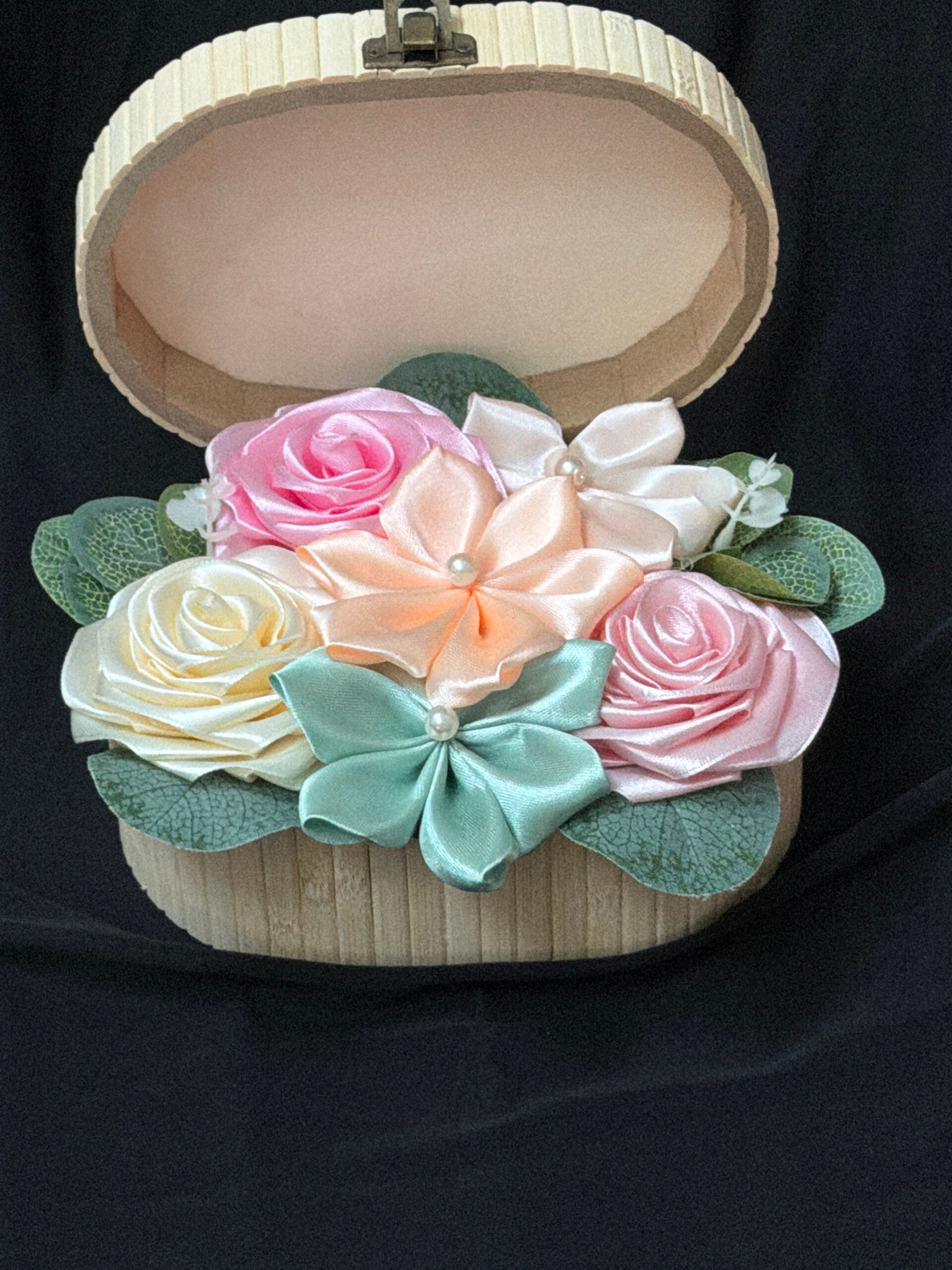 Composition en satin douce et raffinée dans son coffret en bois réalisée à la main