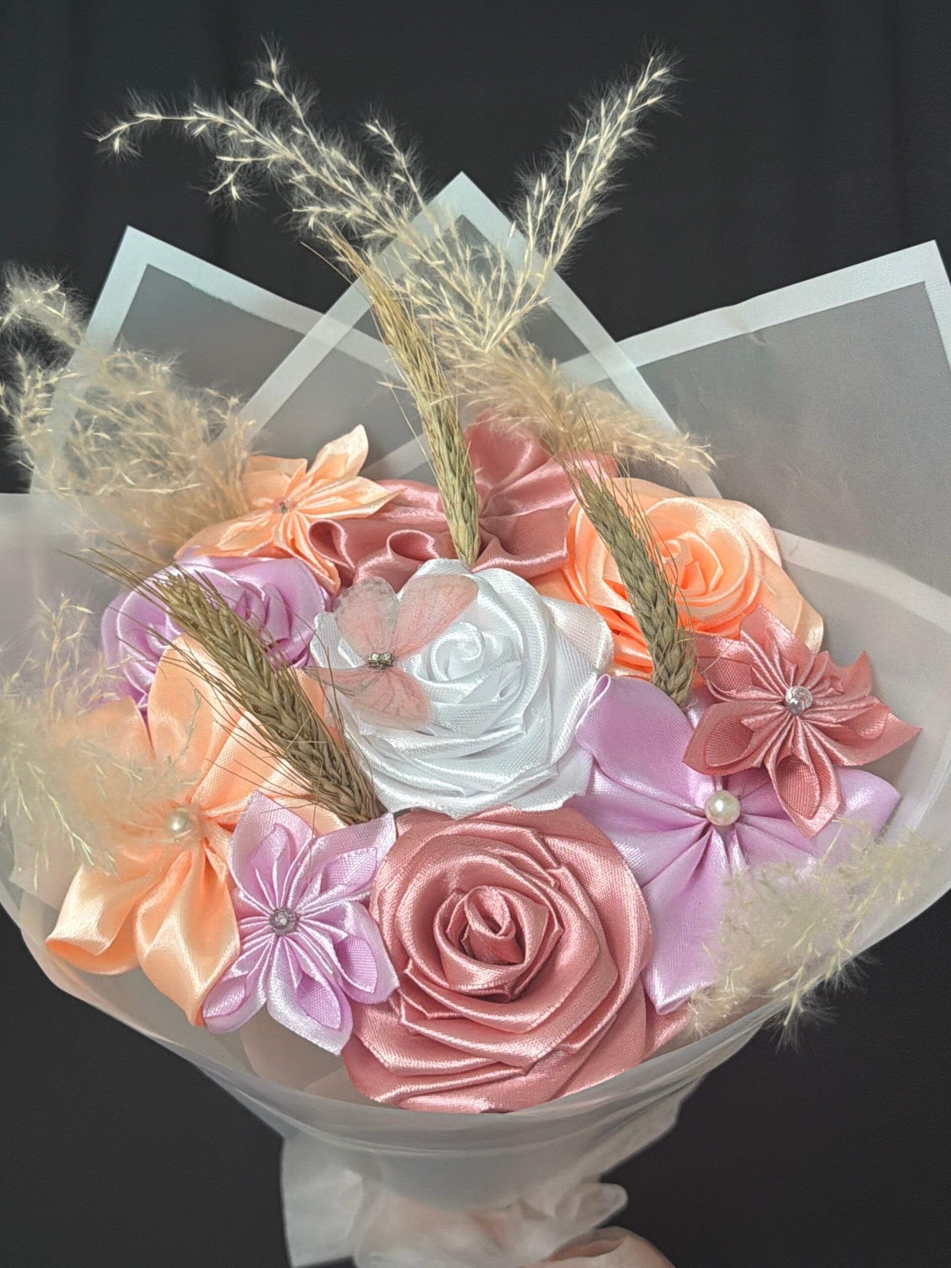 Bouquet en fleurs de satin réalisés à la main pétales par pétales