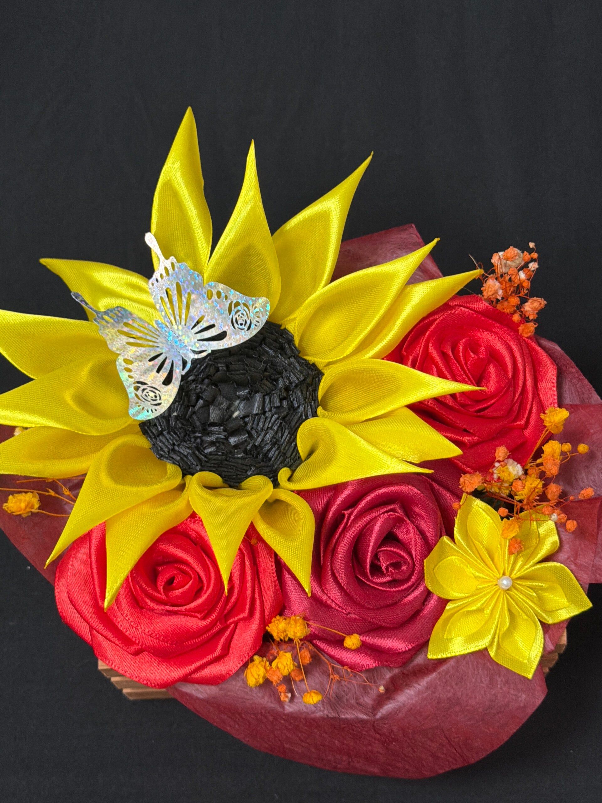 Composition en satin rose et tournesols lumineux